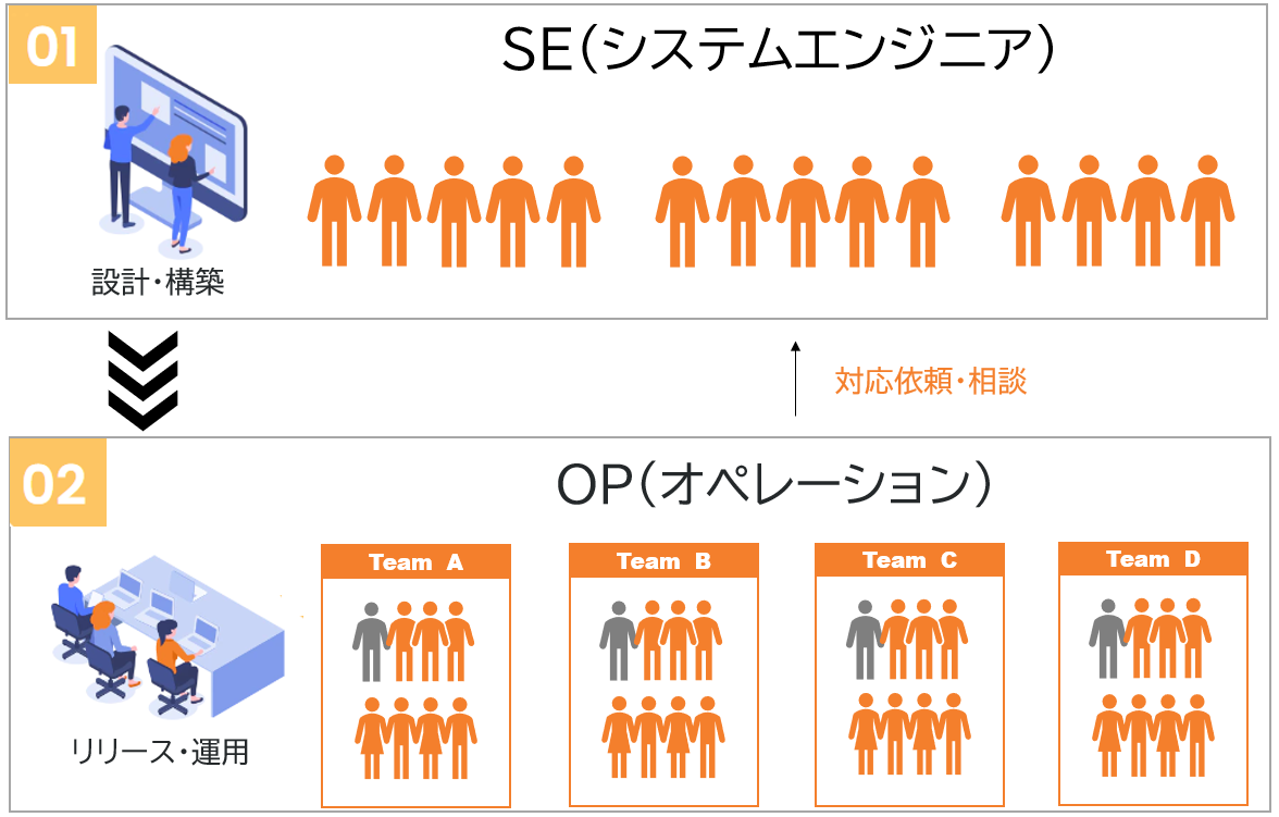 【2】OP(オペレーション)のチーム:1チーム8名程度×4チーム(チームリーダー1名)