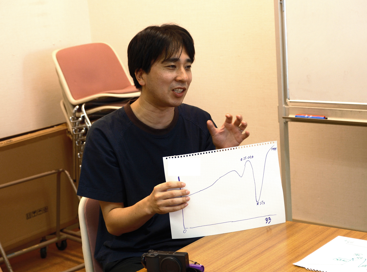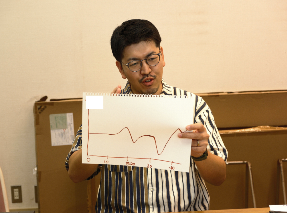 初対面のメンバーもいる中で、アイスブレイクを兼ねて取り組んだのが「人生グラフ」の共有です。自分のこれまでをグラフで振り返り、幼少期から現在までの“転機”や“心に残った出来事”、そしてそれを通じて何を感じ、どう考えたかを5分で発表してもらいました。これは、以前のストーリーでも紹介した、POPER恒例の「自分史」のミニバージョンのような取り組み。