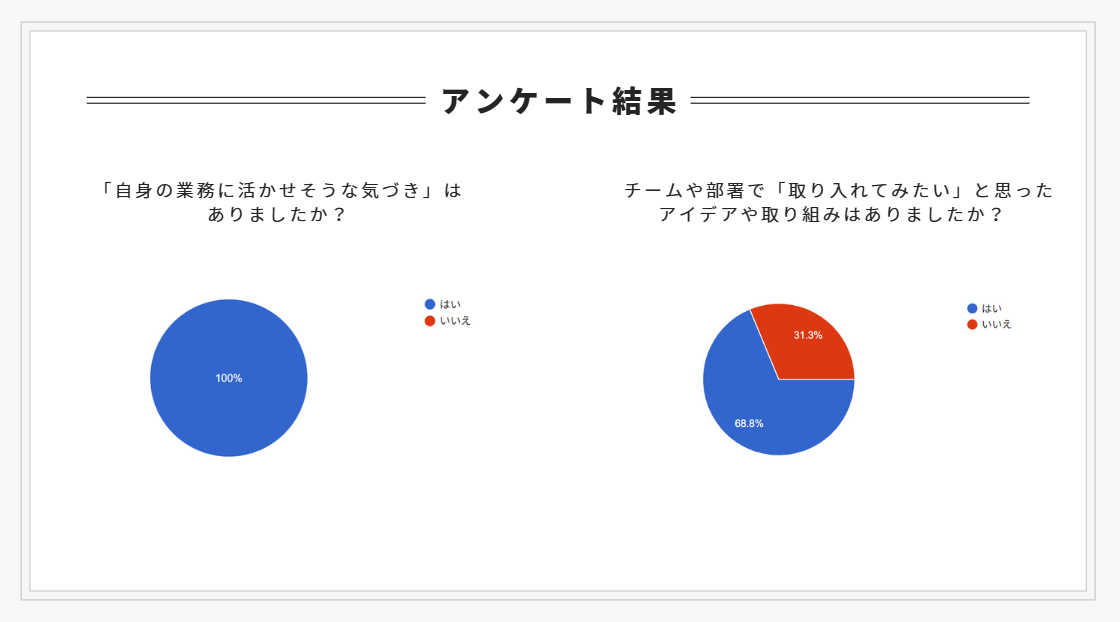 ・他チームのメンバーがやっていること、持っている情報を知ることで自分の業務にプラスになると感じました。