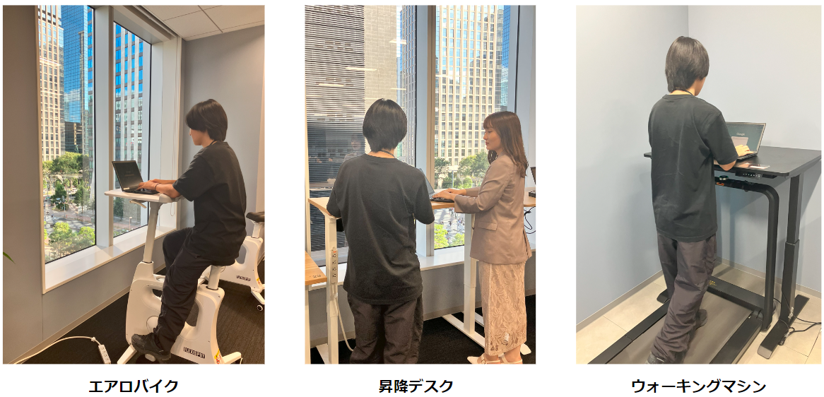 ポートでは、こういった運動不足解消に向けて、エアロバイクやウォーキングマシンで運動をしながら仕事ができるデスクや、立った状態で仕事ができる昇降デスクがあります。