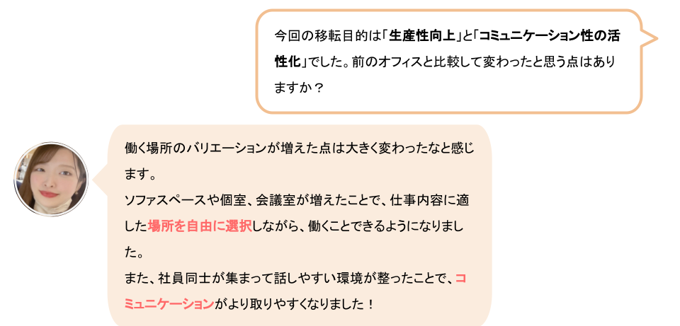本記事では、前述の「生産性向上」と「コミュニケーションの活性化」に着目し、新しいオフィスについて、3つのポイントに分けて紹介いたします!