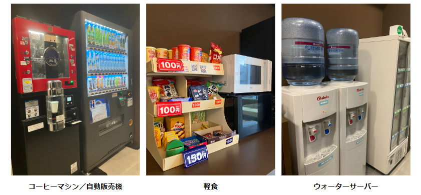 オフィス内でお菓子や軽食、飲料物等を販売をしています。こちらのコーヒーマシンはなんと1杯20円で購入可能です!また、ウォーターサーバーはいつでも自由に使用可能です。