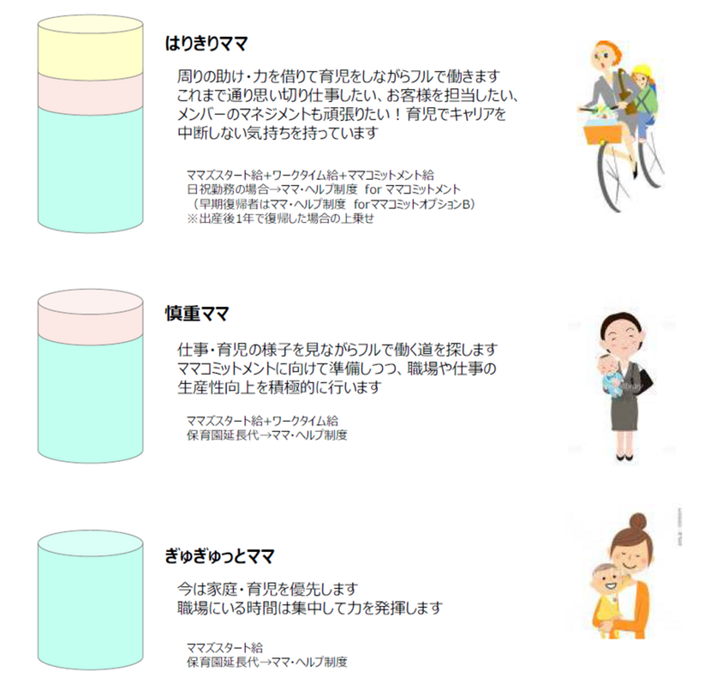 人事評価制度の変更に伴い、働くママへの支援である「ママズ制度」も刷新。復帰支援から戦力化支援という形への転換が重要な変更ポイントだ。
