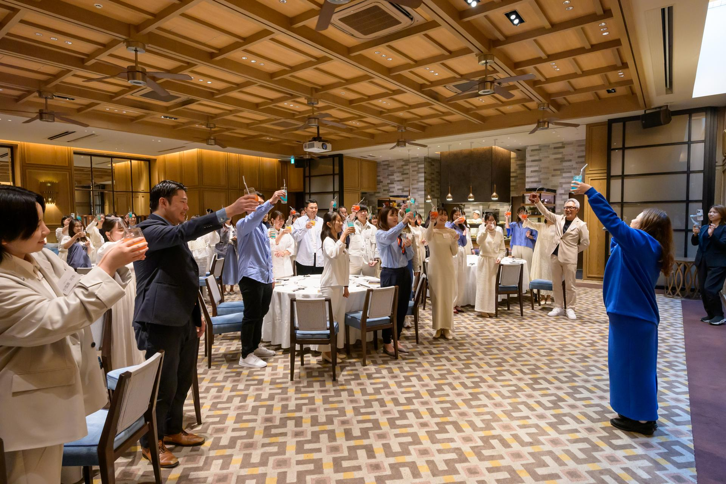 開催会場のウェディングチームに所属する、カリスマプランナー山口さんによる乾杯の発声で会がスタート!内定者達は、初めて会う先輩社員や経営チームの皆さまへ挨拶をしながら、賑やかな会がスタートいたしました。