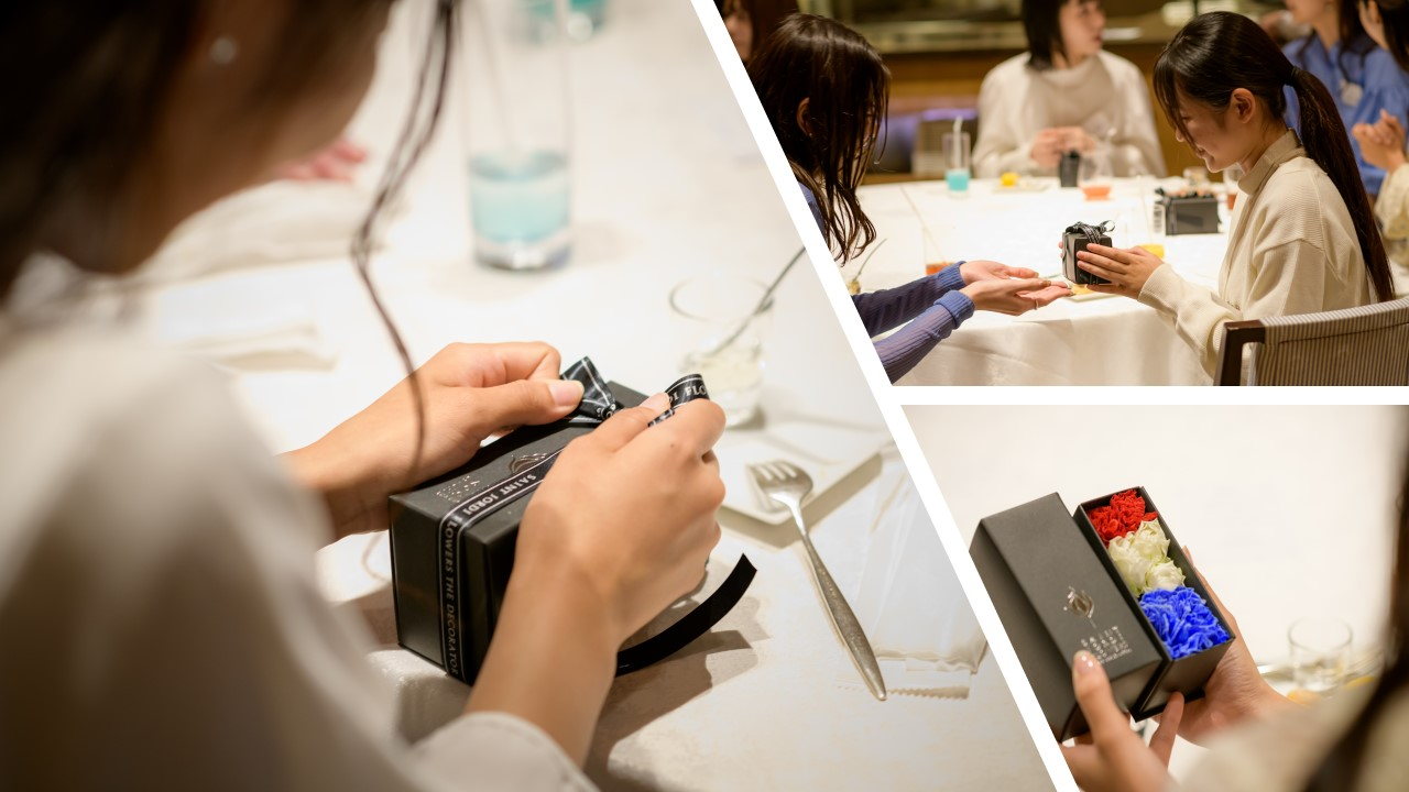懇親会もそろそろ終盤。ここで25メンターから内定者へ、PDPが誇るフラワーブランド【サンジョルディフラワーズザデコレーター】が制作したフラワーBOXを贈呈いたしました。この日のために、フラワーデコレーターが思いを込めて制作してくれたギフトです。
