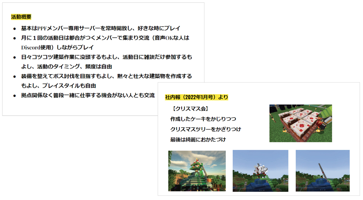 現在、この制度を使って弊社には「マインクラフト同好会」があるのですが、今回はその活動をスライドで紹介していただきました。