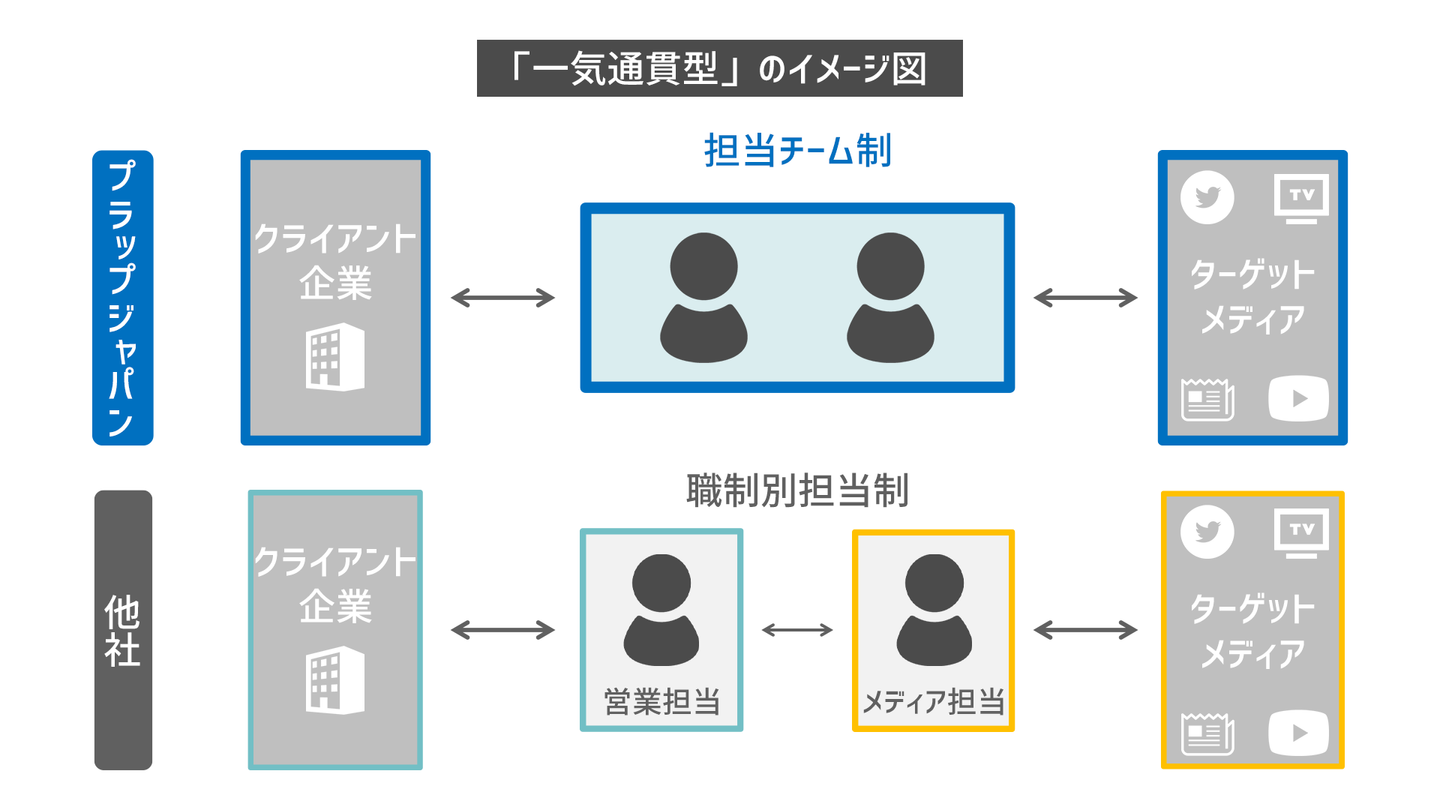 一気通貫型の支援とは、クライアントに対するヒアリングから意見のすり合わせ、プロジェクトの実行やメディアプロモートまでをチーム単位で担う支援方法です。