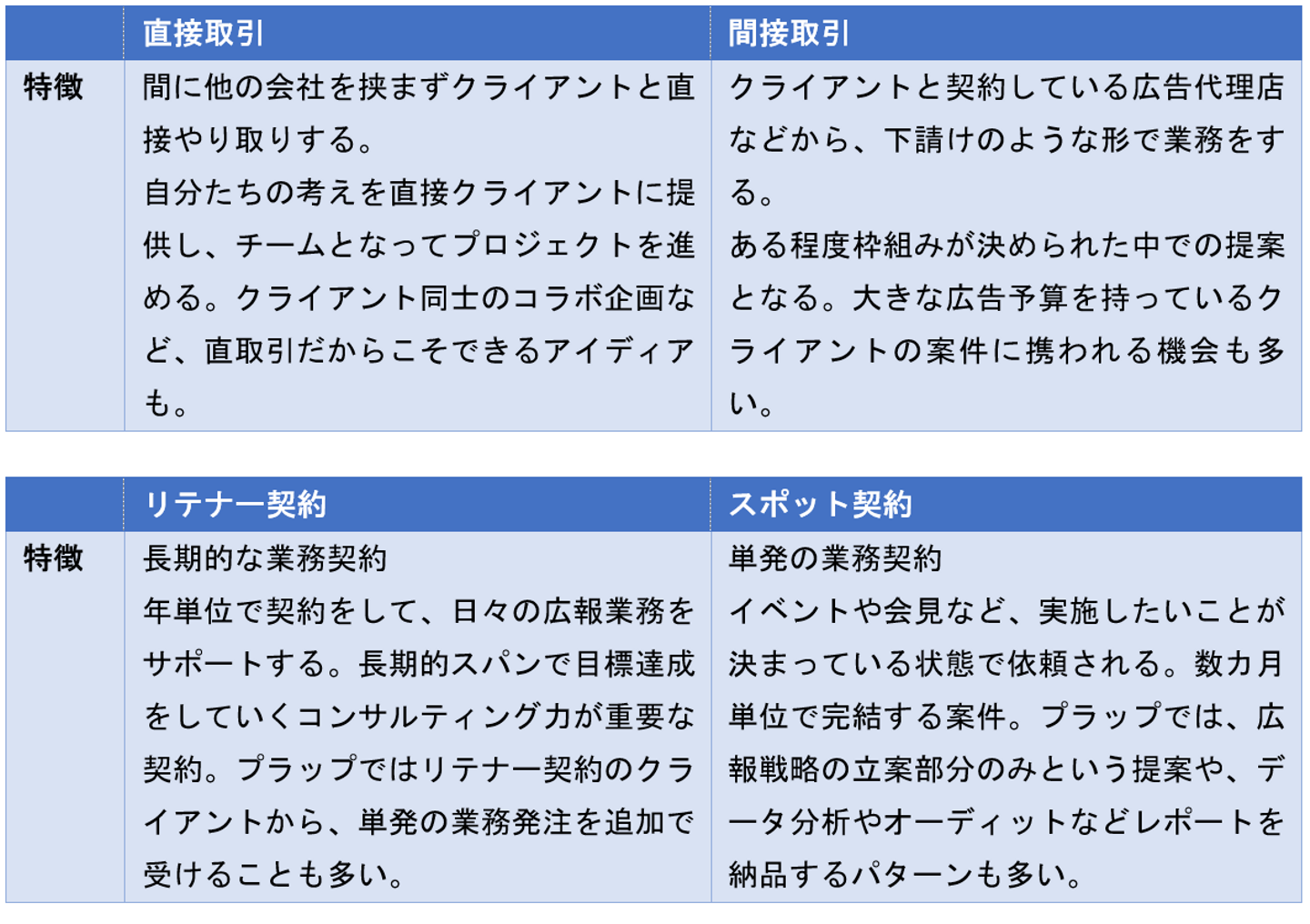 まず仕事の面では、「直取引」と、「リテナー契約」が多い点が特徴です。中長期的に、直接クライアントに提案し実行していく業務環境は、コンサル力・実行力が確実に身に付きます。成長できる環境があるので、プラップの強みは社員の質ともいえるかもしれませんね。