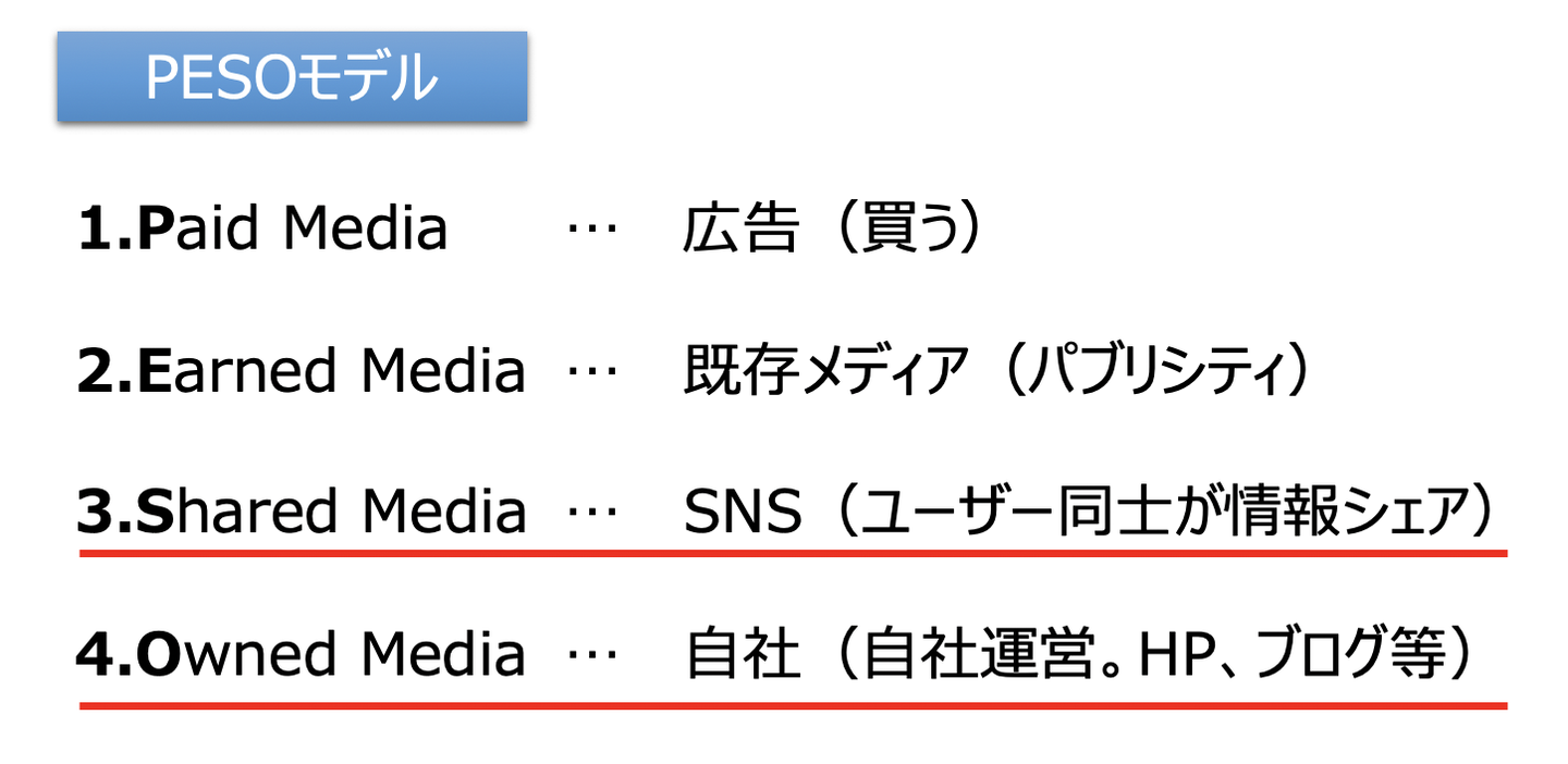 さらに詳しく、どのようにコミュニケーションチャネルが変化しているかについてですが、PESOモデルというものがあります。