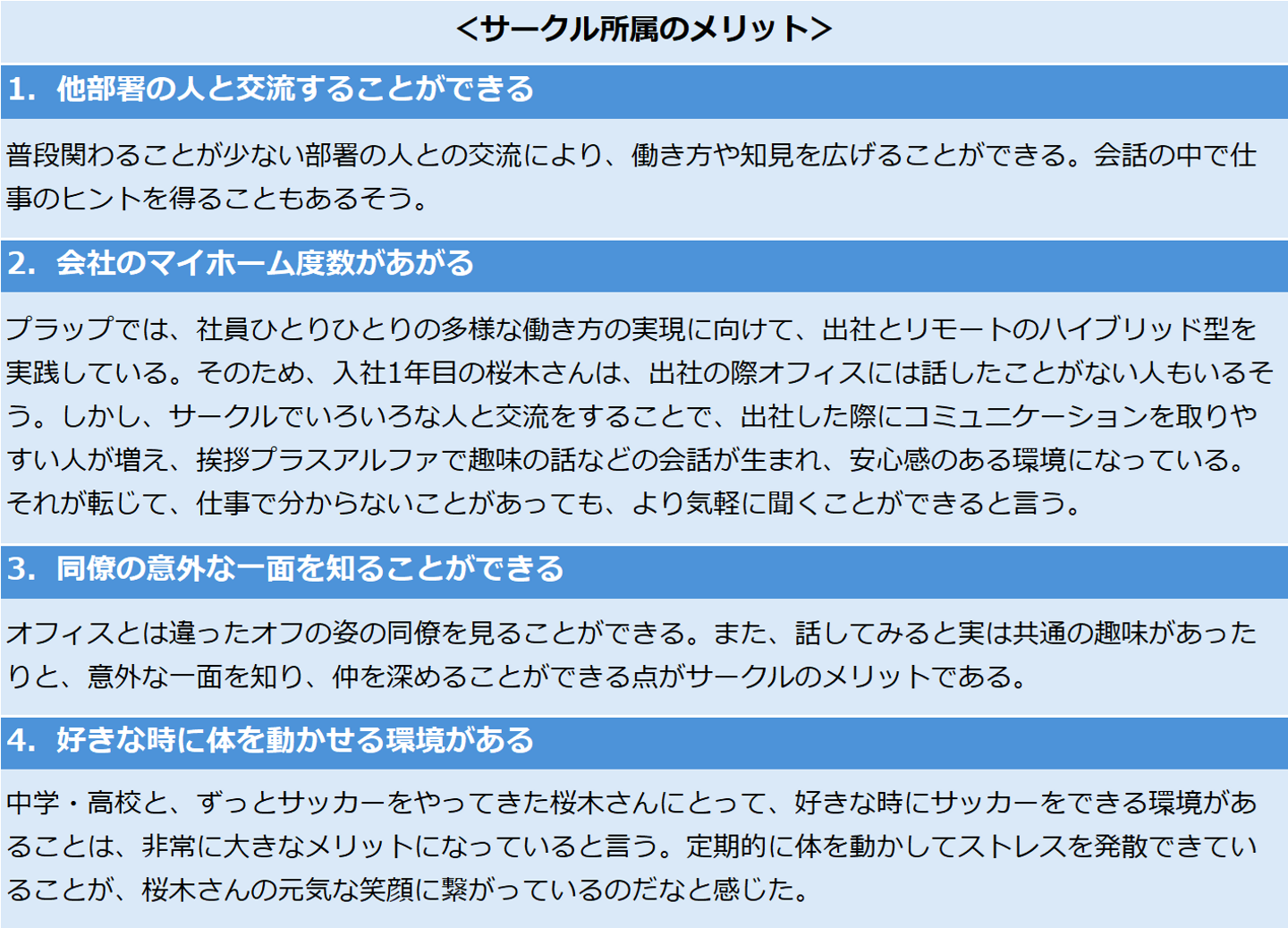 最後に、桜木さんから伺ったお話から、サークルに所属することで得られるメリットを、私たち内定者が4点にまとめました!インタビューの後日、FC PRAPのみなさんとお会いする機会がありましたが、本当にみなさん仲が良く、大学のサークルのような雰囲気で活動されている印象を持ちました!私たちもサークルに所属して、新社会人ライフを楽しみたいと思います!