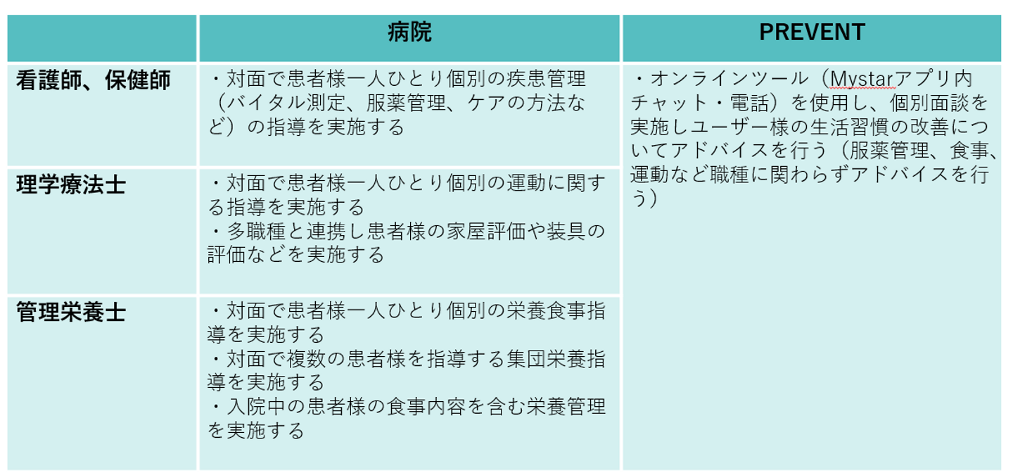 PREVENTの医療サービス部スタッフは、看護師・保健師・理学療法士・管理栄養士などの資格を持つスタッフが所属しています。病院とPREVENTのこれらスタッフのサービス提供の違いついて表にまとめてみました。