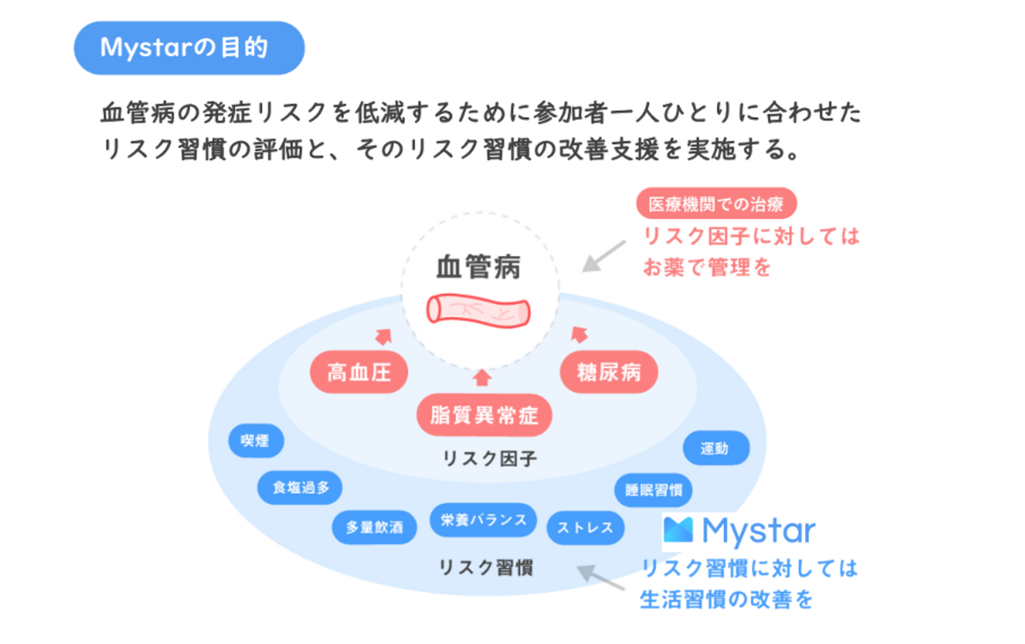 PREVENTでは、生活習慣病を持ち内服治療を行っている方を対象にサービスを提供しています。その際、主治医の先生と書面やユーザー様を介して連携を図りながらMystarプログラムを進めていきます。Mystarは医療行為ではありません。あくまで健康づくりの支援であり、現行の治療を代替するものではなく、医師の治療方針をユーザー様からお伺いしながら、生活習慣の改善の支援をしております。健康増進ができるようにサポートしています。