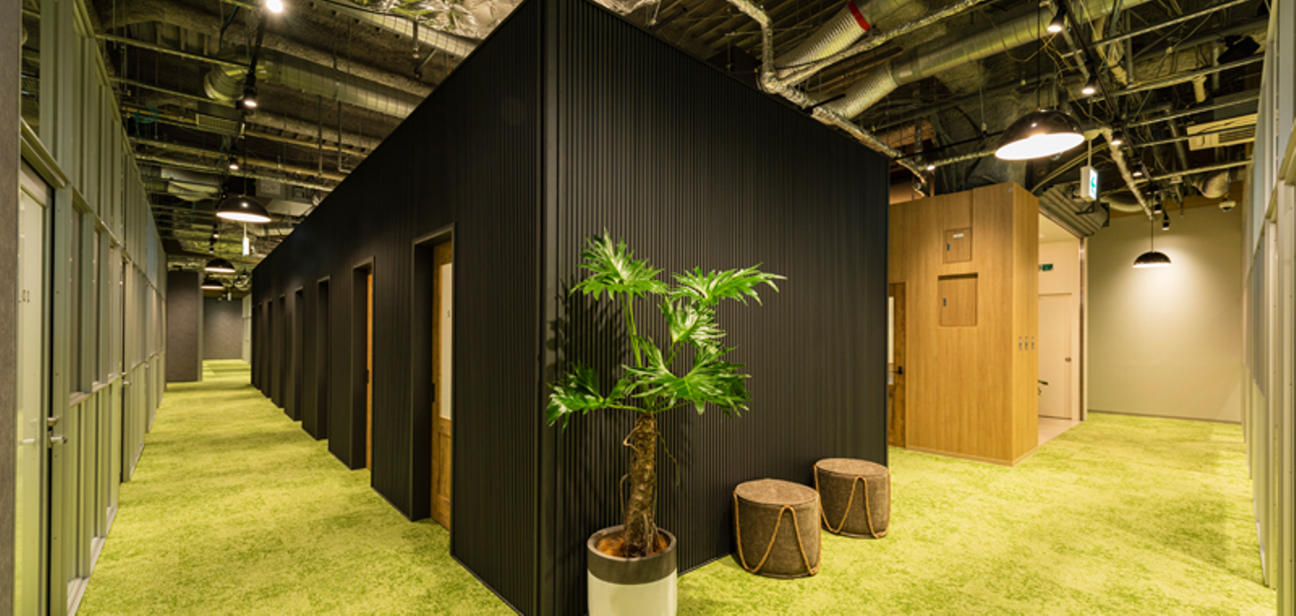 ハイグレードビル カフーナ旭橋を3階へ。天井まで約5mと高く、共有部は洗練されたレイアウトとなっており、 集中力を高める1人用のブースなど、用途に合わせて最適な環境を使い分けることができます。