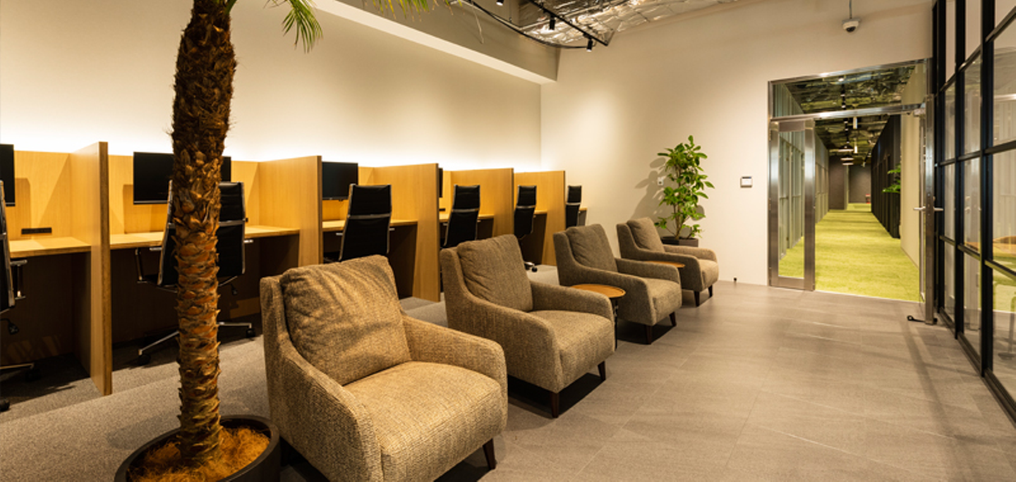 モニター、充電完備の専用ブースや、より集中したいときに使用できるふかふかのソファーが印象的な個室ブースまで完備されています!