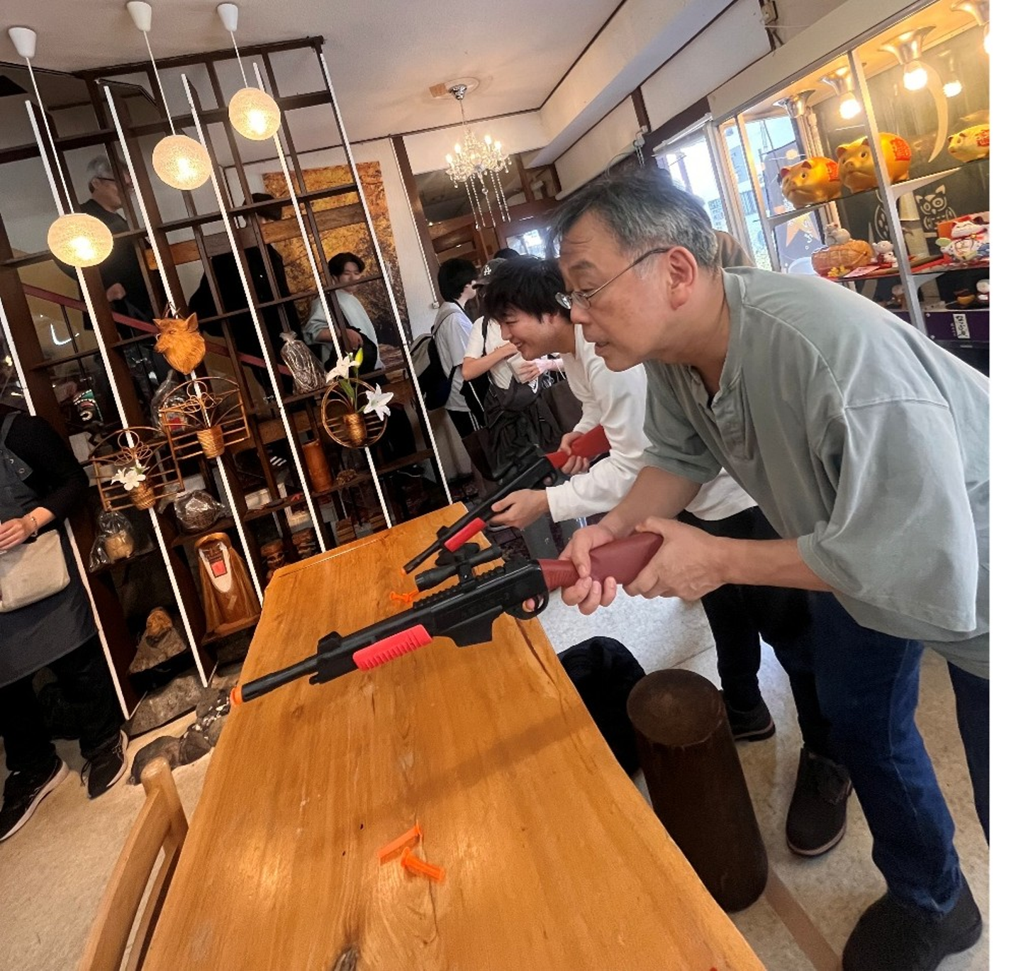 朝食後のひとこまをパシャリ(射的に夢中になる社長VS新入社員)