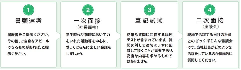一般的な選考は、グループ面接→役員・社長面接という流れであると思いますが、当社の選考は書類選考通過後、社長との1対1面接→グループ面接(座談会)という流れとなっています。