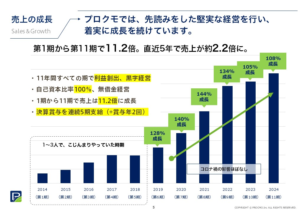 総合マーケティング支援会社のプロクモは12期目に入っています。これまで11期連続の黒字経営を達成し、無借金経営を続けて堅実に経営をしています。