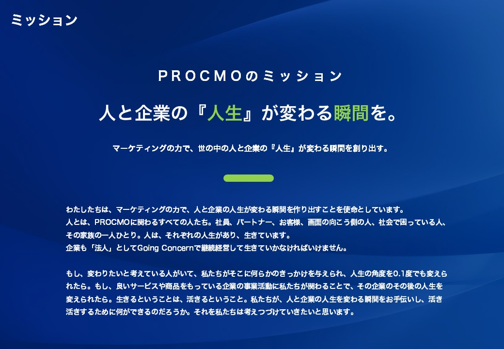 プロクモは単なるマーケティング支援会社ではなく、「人と企業の成長を支える」ことを使命としています。そのため、ミッションとして「マーケティングの力で、人と企業の未来を切り開く」ことを掲げ、ビジョンとして「クライアントの持続的成長を支援し、共に成長するパートナーであり続ける」ことを目指しています。