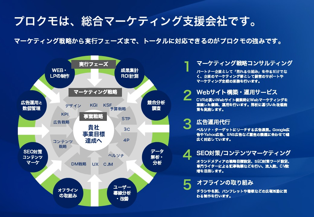 一つ目は、プロクモが総合マーケティング支援会社であるということです。マーケティング戦略支援から、広告、Webサイト構築、デザイン、テレビCM、オフライン展開など幅広いサービスラインナップを揃えています。