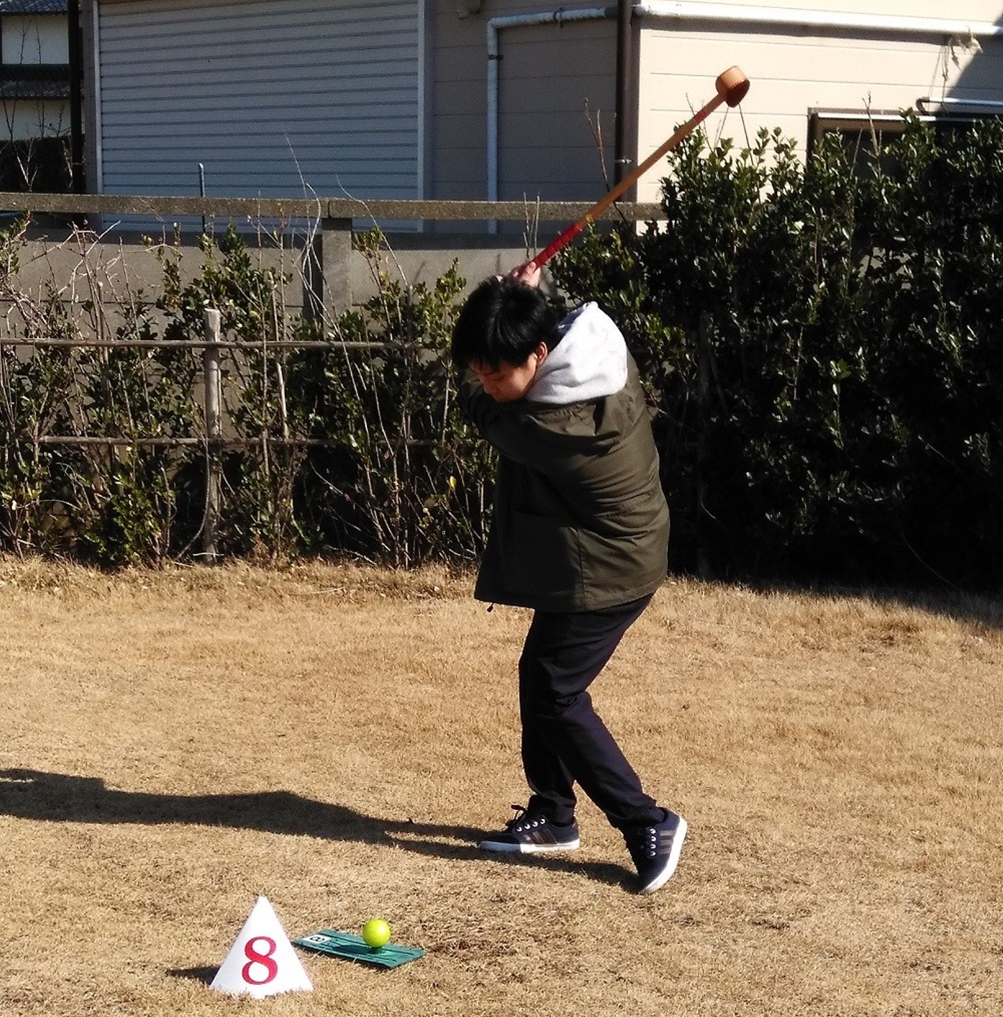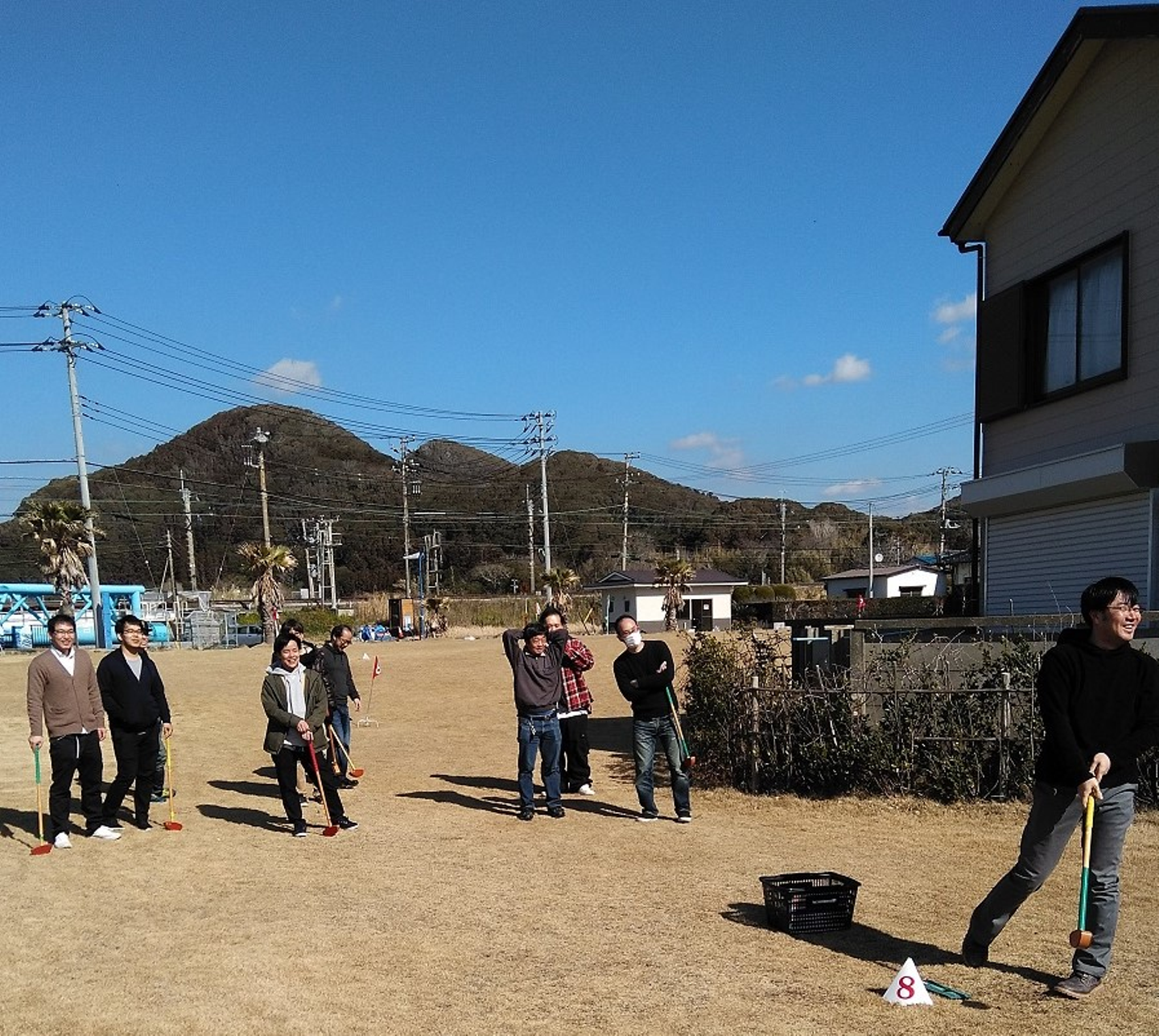 旅館をチェックアウトした後は、同じく鴨川ホテル三日月内にあるグラウンドゴルフ場にて対決を開催。グラウンドゴルフとは、ゴルフのようにボールをクラブで打ち、ホールポストにホールインするまでの打数を競うスポーツで老若男女問わず楽しめます。この日は4つのチームに分かれて、ニアピン対決、飛距離対決、コース対決、ピンを並べてボウリングのような対決と数々の対決を行いました。