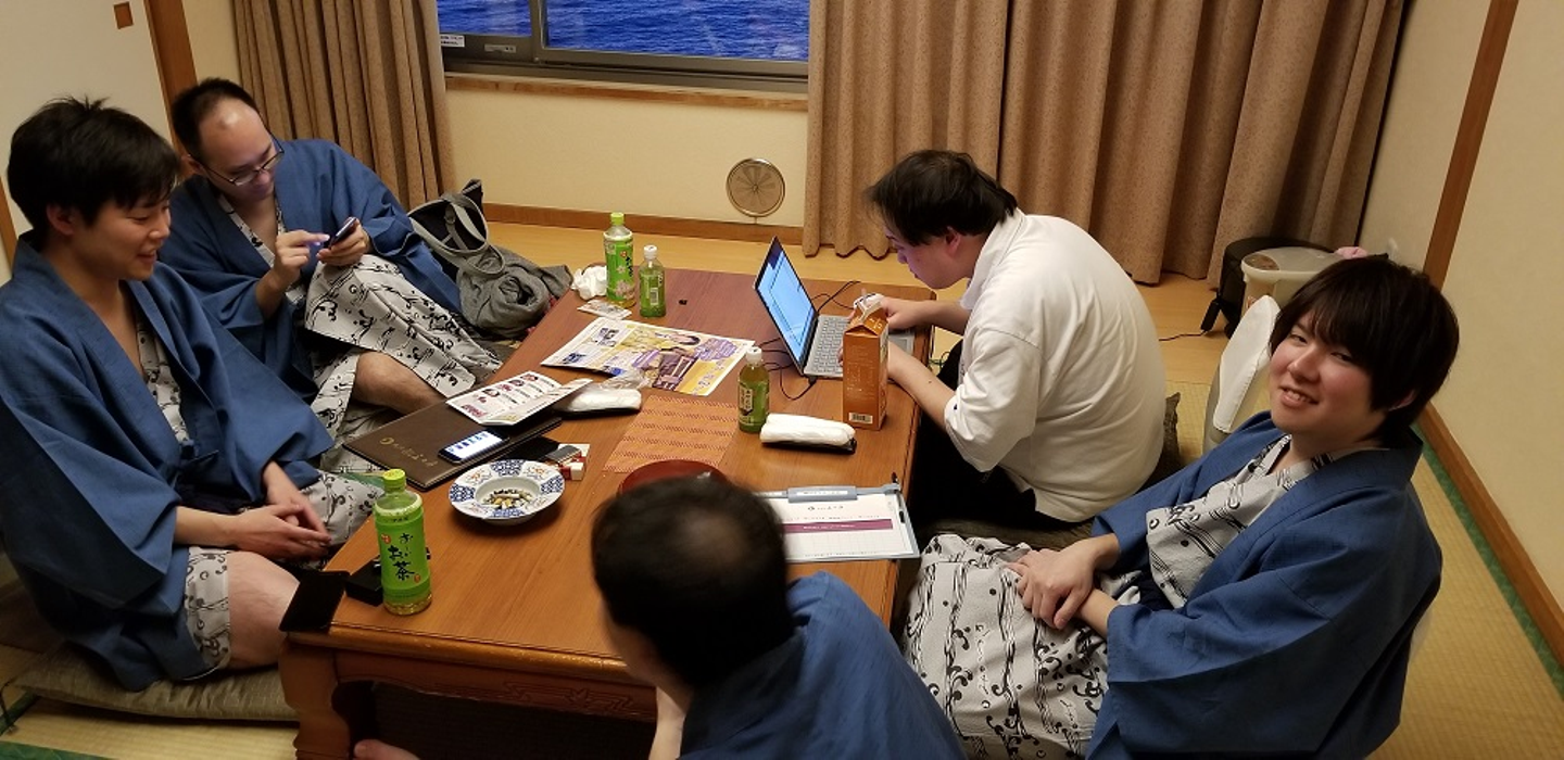 なんと、エンジニアの〇〇さんは、部屋の鍵を持たずに深夜まで麻雀ルームにいた結果、部屋に入ることができず、大浴場の休憩所で寝ていたそうです・・・風邪は引かなかったようで一安心。