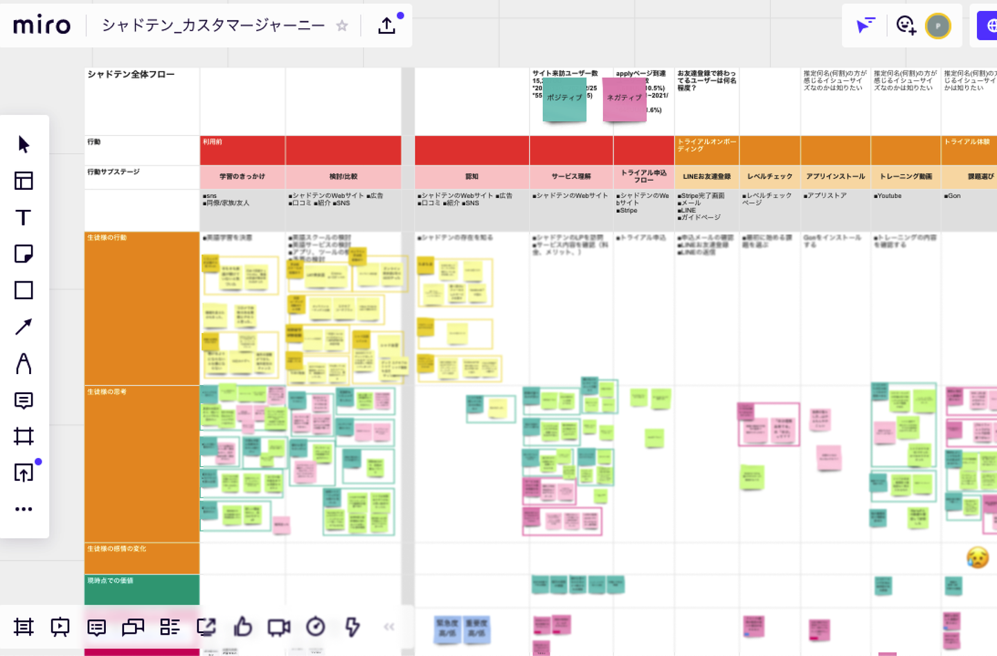 インタビュー後はペインポイントを深堀してお客様のどんなIssueを解くのか、そのIssueが優先して解くべきものなのかを、デザイナーやマーケティングなどのメンバーと一緒に議論していきます。プロダクトマネジャーは全体の進行や意見の収集、解決すべきIssueの優先度決め、ネクストアクションを決めていきます。(スクショのmiroはデザイナーがフレームを用意しプロダクトマネージャーが適宜加筆など行なっています。)