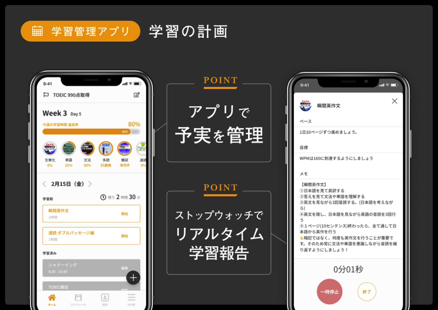 英語力の向上において大切な「学習投下時間」と「生産性」をマネジメントするプロダクトです。学習時間や各学習における指標などのデータをコーチングに活かすことで英語力の伸びを最大化することを目的にしています。
