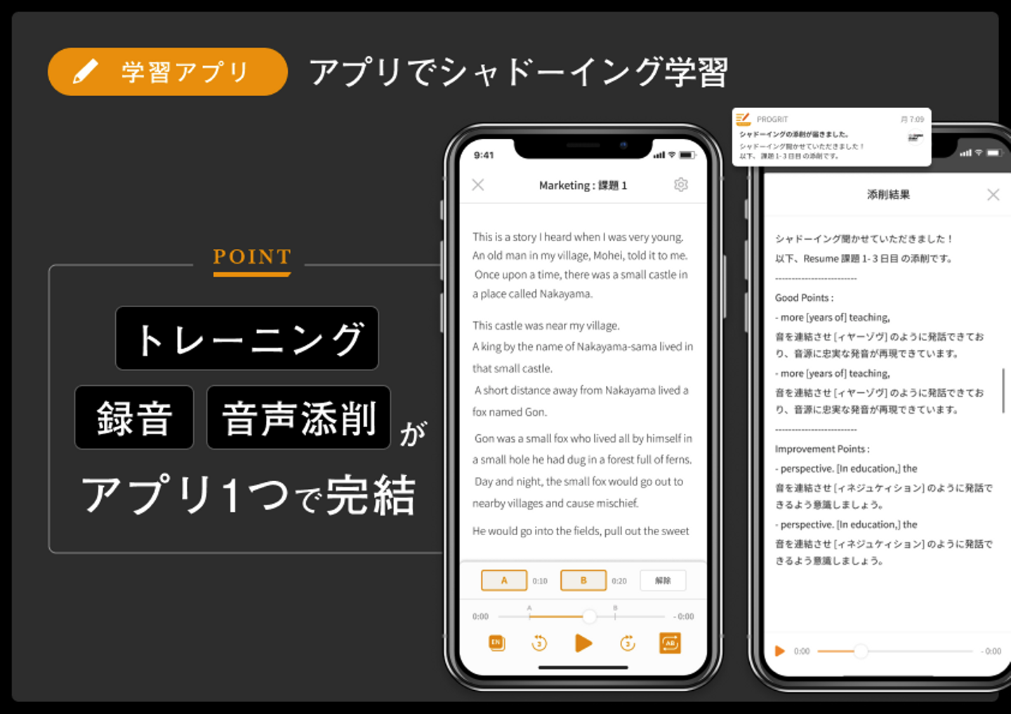 リスニング力向上に特化した「シャドテン」とスピーキング力向上に特化した「スピテン」の2つを提供しています。