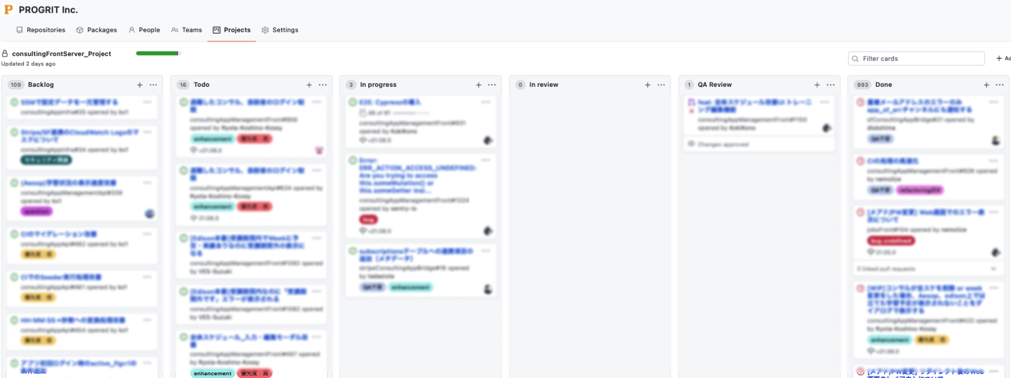 エンジニアがGithub Issueに沿って開発を進めます。各案件で質問や仕様調整を行う際は基本的にGithub Issue上でコミュニケーションを取ります。(必要に応じてMTG等で口頭コミュニケーションも行います。)実装が終わったらカンバンのQA Reviewに移動してQAさんがテストしてリリースです。プロダクトマネージャーはリリース前後で全体的な動作確認を行なっています。