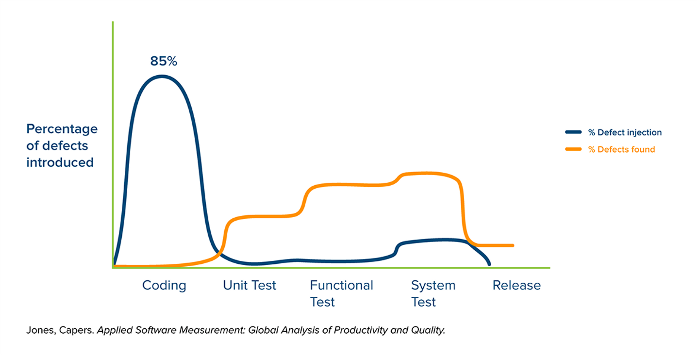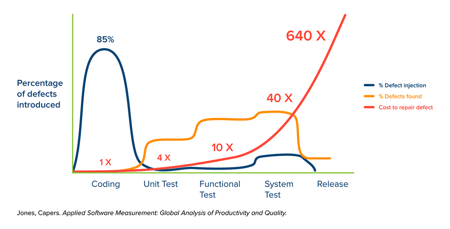 上の図はアジャイルやDevOpsといった開発手法でよく見られるShift-left testingモデルの「バグを作るタイミング(青線)とバグに気づくタイミング(オレンジ)と改修コスト(赤線)」を表したグラフです。