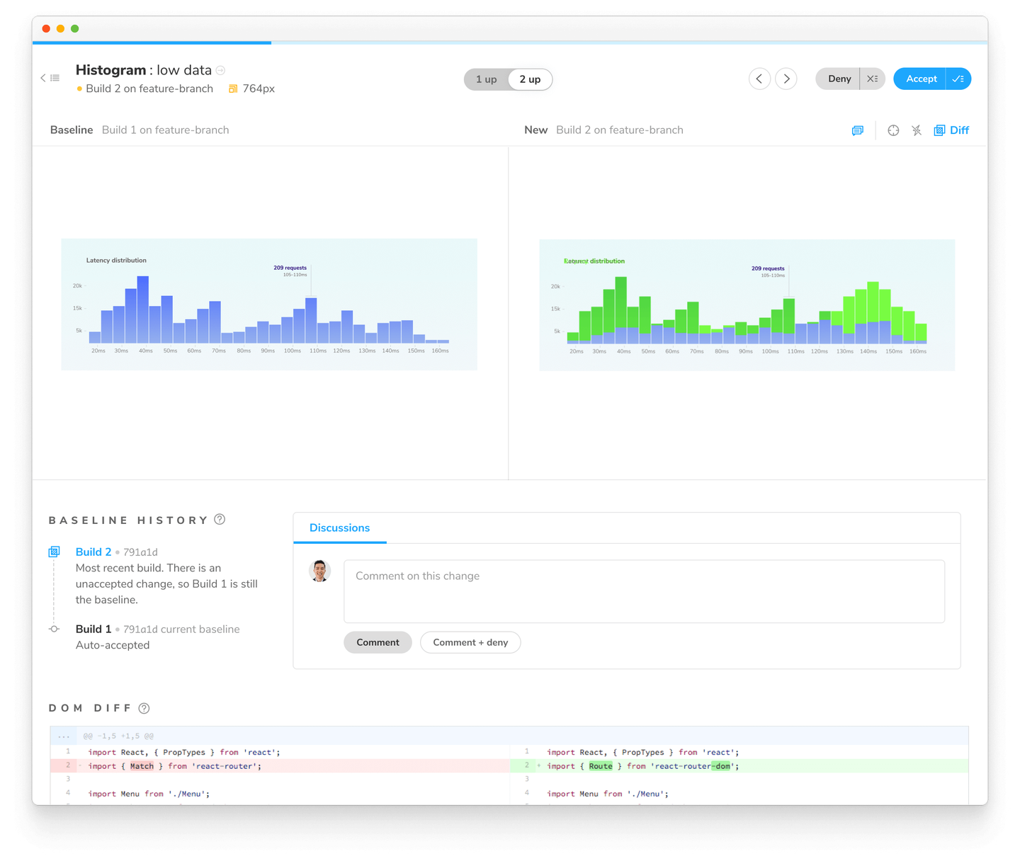 下記(良いサンプルが無かったので、公式から持ってきました)のように、Baseline(メインブランチ)と作業ブランチとDiffがあれば検知してくれます。
