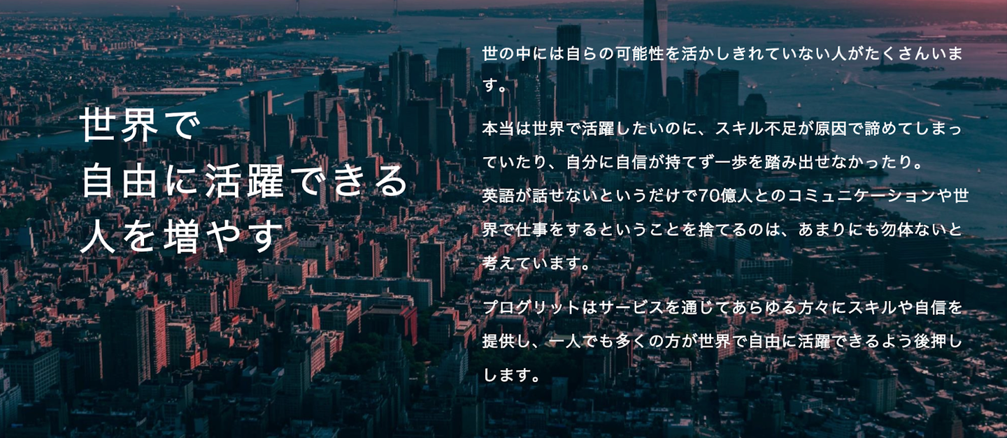 世の中には自らの可能性を活かしきれていない人がたくさんいます。本当は世界で活躍したいのにスキル不足が原因で諦めてしまっていたり、自信が持てず一歩踏み出せていない方が多くいるのが現状です。プログリットは、サービスを通じてあらゆる方々にスキルや自身を提供し、一人でも多くの方が世界で自由に活躍できるように後押しします。