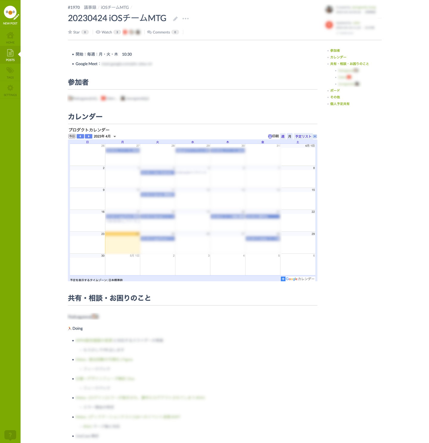 iOSチームに関しては以下のほかチームと同じようにリリース後に「座談会」を行っておりますが、それとは別で週3回、午前中に「朝会」を開いています。