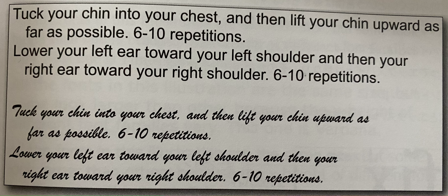 日本語訳:あごを胸まで引く。その後、顎をできるだけ高く上げる。これを6〜10回繰り返す。左耳を左肩の方へ下げて近づけ、その後右耳を右肩に近づける。それを6〜10回繰り返す。