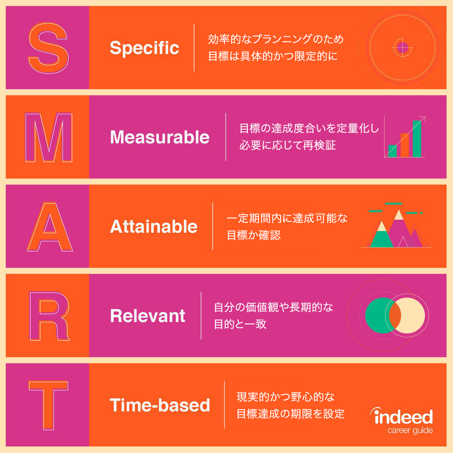S pecific(明瞭であること) M easurable(測定可能であること) A ttainable(達成可能であること) R elevant(関連性があること) T ime-bound(期限があること) 画像引用: indeed