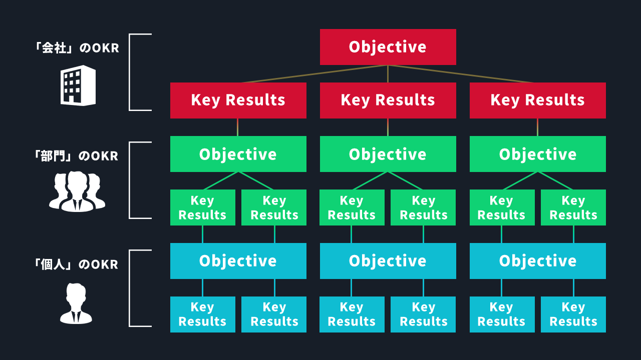 定性的な(数値で表せない)目標であること 野心的/挑戦的な目標であること 1カ月~3カ月で達成できる目標であること 中でも 「企業の目標」は特に重要で、全体のOKRに影響 します。というのも基本的には「企業の目標」に対して「部門の目標」が紐づき、「部門の目標」に対して「個人の目標」が紐づくといったように、 上から下へ階層構造になっている からです。