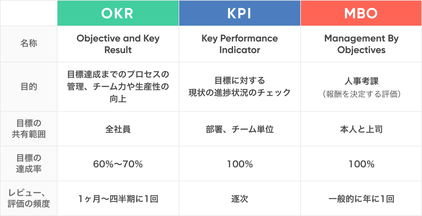 KGI/KPIとの違い OKRと混同されやすい用語の代表例として 「KGI/KPI」 が挙げられます。ちなみにKGIは「重要目標達成指標」、KPIは「重要業績評価指標」の意味を持ちます。