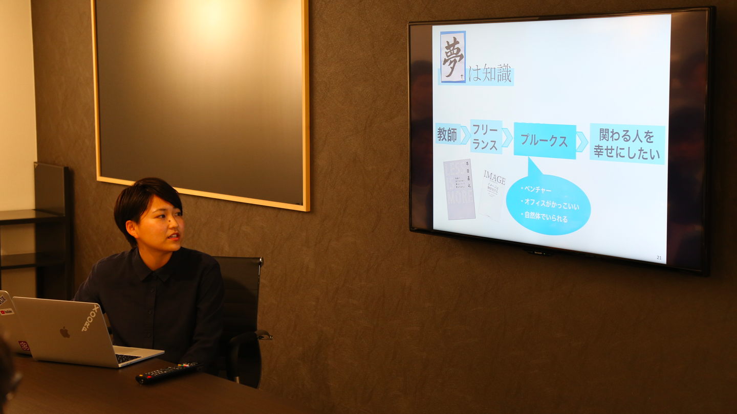 実際に新卒学生を呼んで行なっている会社説明会で、自分はどういう風に生きてきて、なぜプルークスを選んだのか、これからどうなっていきたいのかをプレゼンしました。