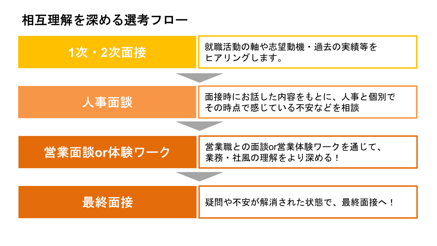 そんな悩みを抱えながら、選考ステップだけがどんどん進んでいくという状態にならないように、当社では、最終面接前に人事との個別面談を設定し、そこで就職活動の軸とマッチしているのかのすり合わせや、そもそもの就職活動の軸の棚卸しができるようにしています!