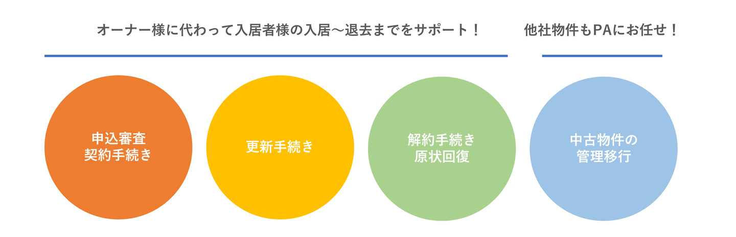 守山さん:不動産のオーナー様に代わって、入居者募集から賃貸契約手続きなどの管理業務を担当するのがプロパティマネジメント課です。⼊居者様には「快適な暮らし」を、オーナー様には「安⼼経営」を届けます。当社がメインで扱っている不動産は投資用不動産なので、入居率が非常に重要になりますが、当社の管理物件の平均入居率は99%を超え、業界でもトップクラスの水準を維持しています!そんな入居率を支えるPM課では、下記のように業務をチームで分担しています!