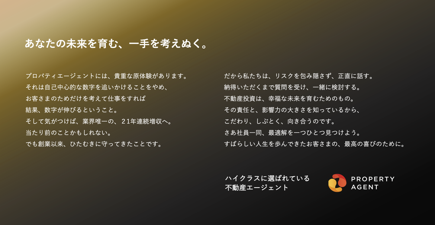 ハイクラスの方々に多く選んで頂いている事実とその理由は、「未来のハイクラス層」の方々にとっても、プロパティエージェントを選ぶ理由になる=プロパティエージェントの強みだと考えています。これからもハイクラスの方々に選ばれる企業であり続けると同時に、より多くのお客さまに プロパティエージェントの魅力が伝わるよう取り組んでまいります。
