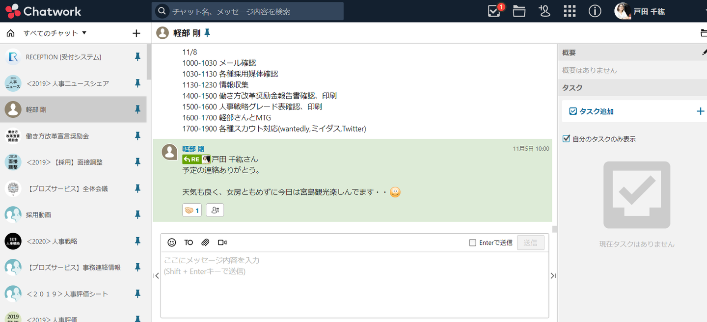 当社は社員は客先常駐しているので、社内連絡は99%チャットで行っています。(残りの1%は会社メール)