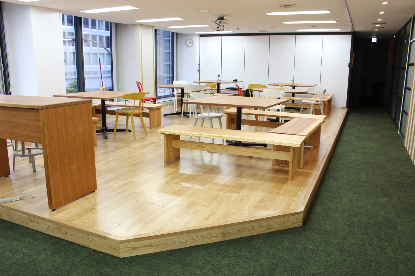 残念ながら社員全員の席を用意できません。帰社して、勉強したい・作業したいというニーズがある社員はには明るくて綺麗なカフェスペースを使ってもらいます。