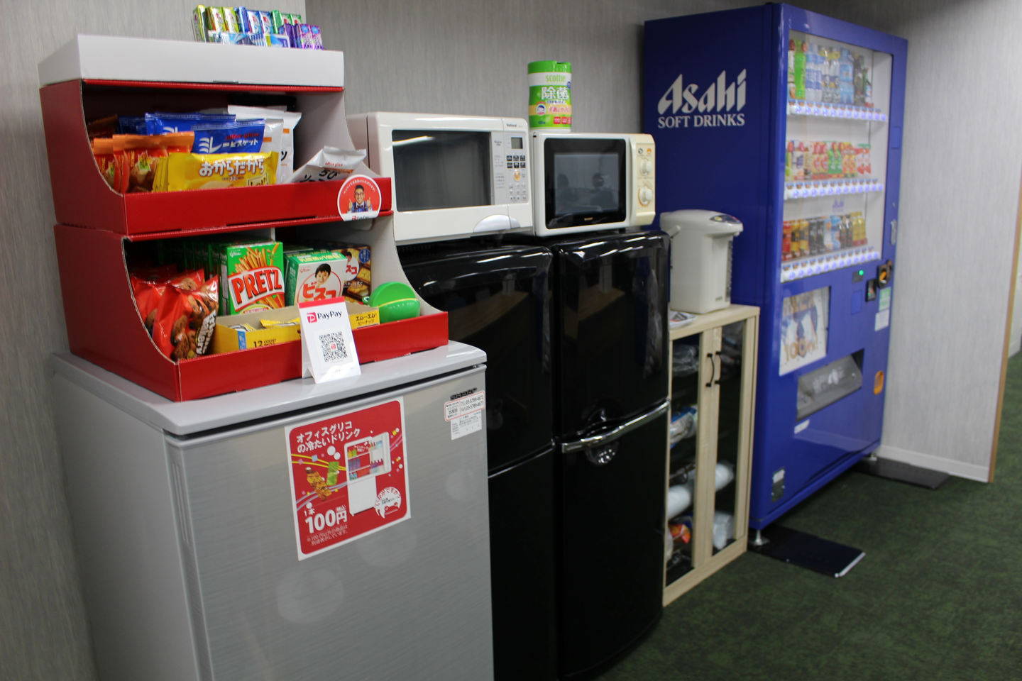 執務スペース内に自販機1台とオフィスグリコがあります。自販機は残念ながら現金のみで、缶が90円、ペットボトルが120円、エナジードリンク(モンスター)が200円です。オフィスグリコは現金かPayPayです。