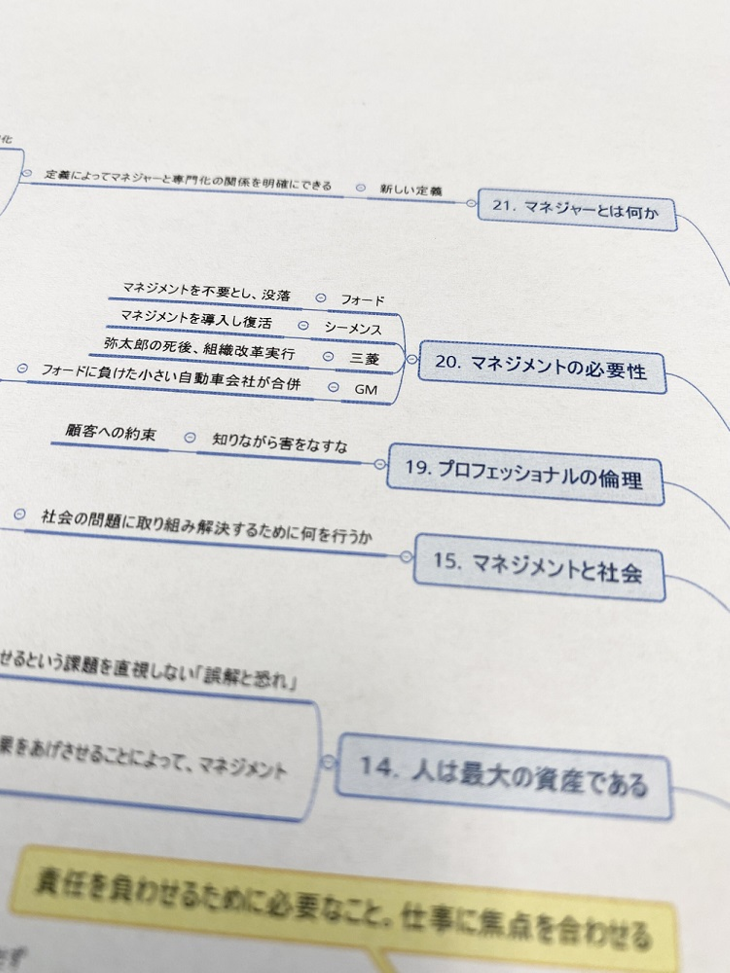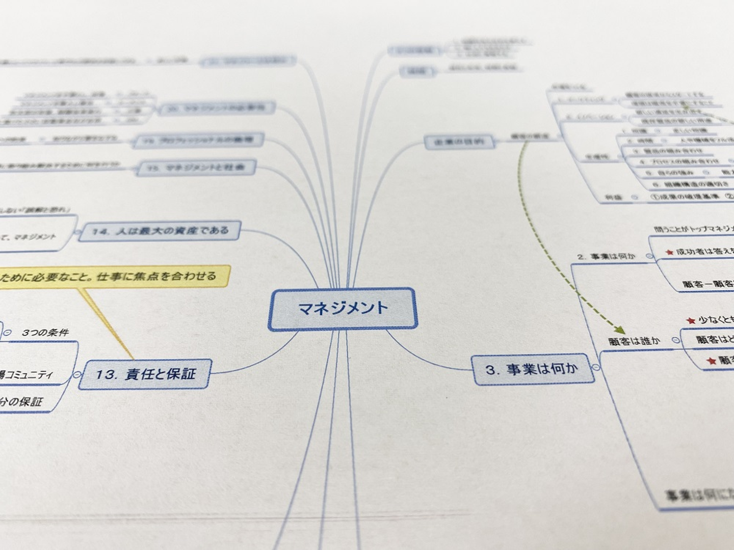 ボヤけていますが14番は「人は最大の資産である」と書いてあります。ここ最近「人的資本」として人は問題やコストではなく重要な資産なのだと政府が声高に言っていますがドラッカーさんは約50年前の本書でそれを言い表しています。先見性の凄さに舌を巻きつつ、もしかしたら官僚の人たちも何周かしてまたこの本を読み直して今後の指針にしたのかも知れません。