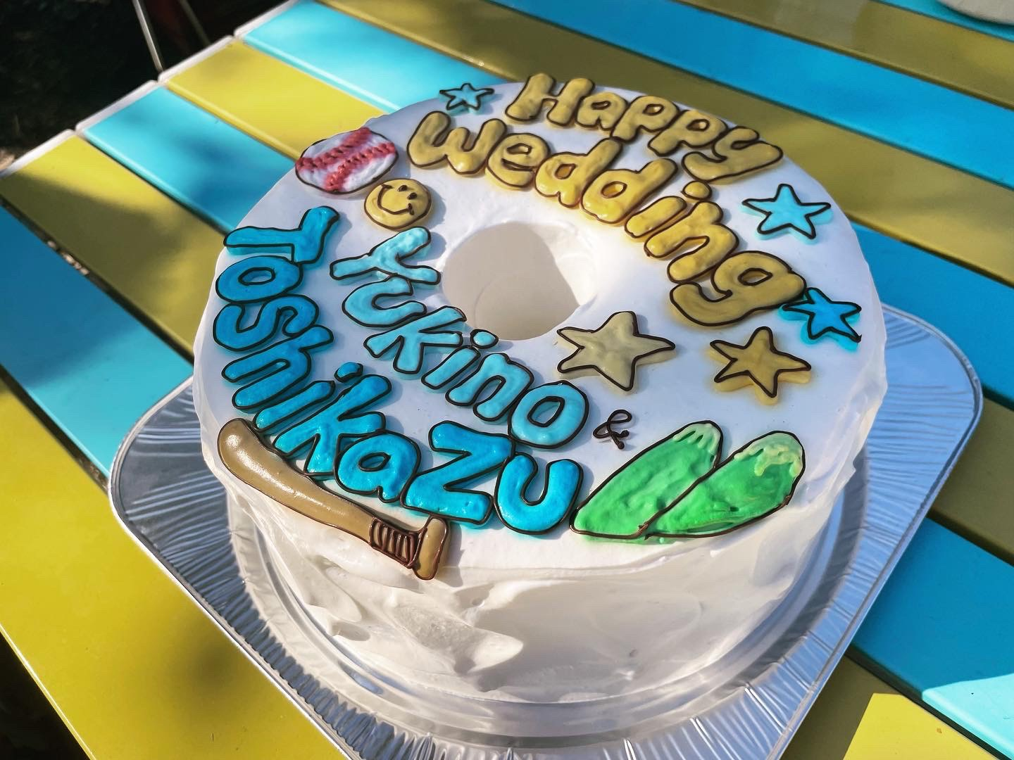 サプライズケーキ☆☆ 登山が好きな二人なので、山の絵を書いてほしいとケーキ屋さんに依頼したら、何故かボールとバットも描いてくれました。なんだか野球が好きな二人になってしまいました(笑)でも美味しかったので許してください〜