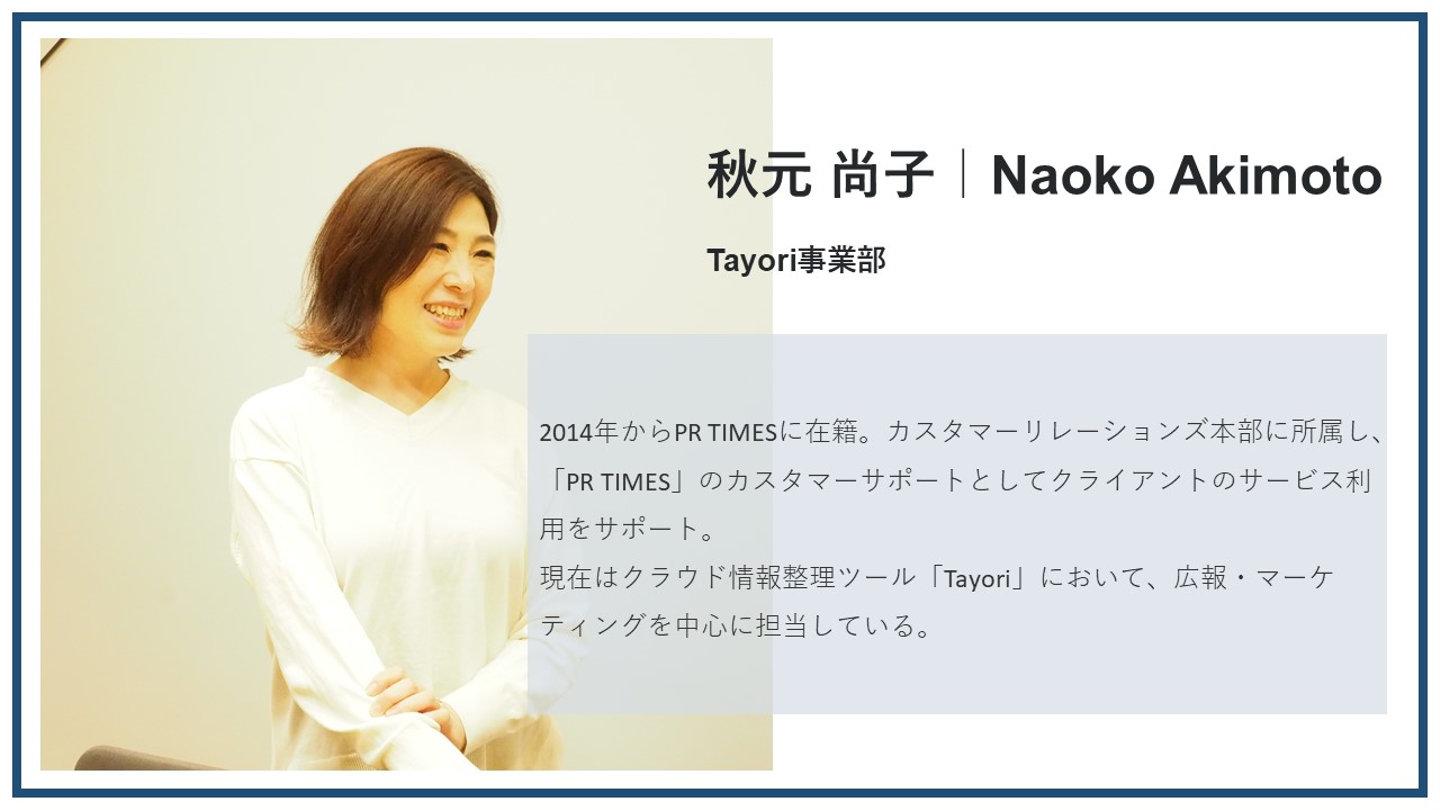 秋元:そうですね。PR TIMESでは2014年にプレスリリース配信サービスのカスタマーサポートとして派遣社員で働きはじめました。2015年に契約社員に変更し、Tayoriに関わり始めたのは2018年からです。時短勤務で家庭と両立しながら、一日一日があっという間な毎日ですね。