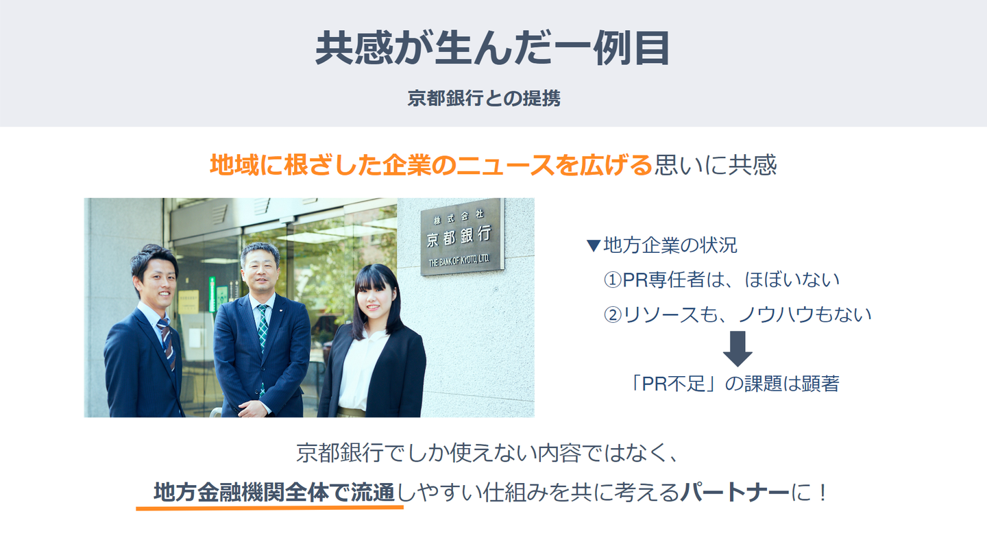 プロジェクトの目的は、地元の枠を超えてニュースが流通する仕組みを作ること。と言うのも地方の企業には、インターネットで全国に情報発信する方法がまだまだ浸透していませんでした。ただ地方の企業の方の中には、PRに馴染みがない方が多いのも事実。そこで、地方企業にとって身近な存在かつ信頼のおける存在である地方金融機関にアプローチをかけることにしたんです。