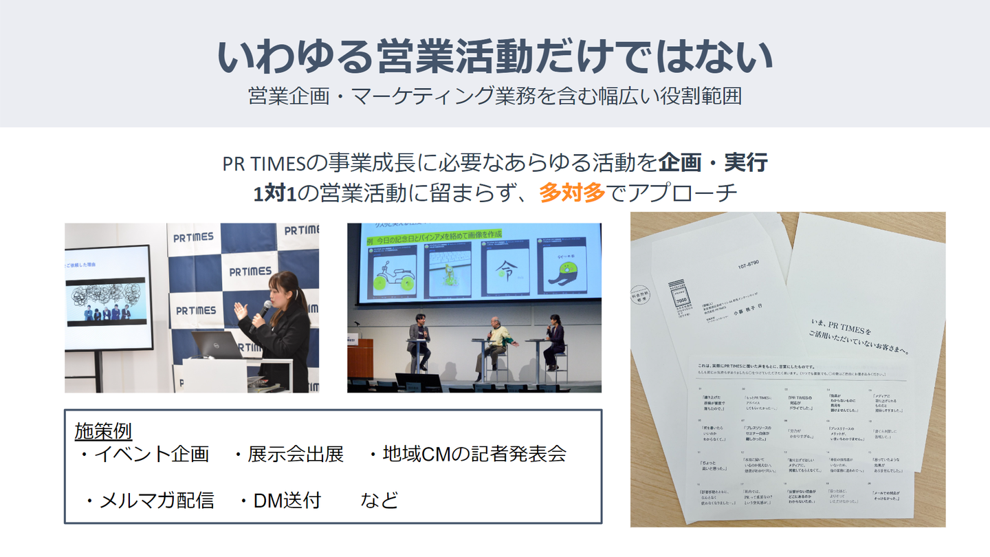 主に未利用の新規のお客様に対して、PR TIMESだけではなく他サービスやその他PR施策など幅広く提案しています。またPRの面白さややりがいについて啓蒙するイベントについても幅広く企画運営しており、能動的に情報発信する企業様、ご担当者様が少しでも増えればという想いがあります。