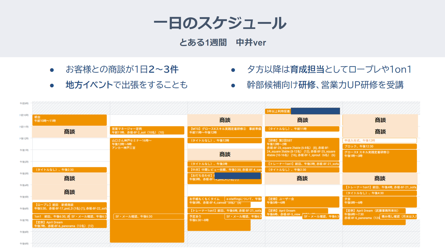 次に、より具体的に営業本部の業務をイメージしてもらうため、僕のとある一週間のスケジュールを紹介します。